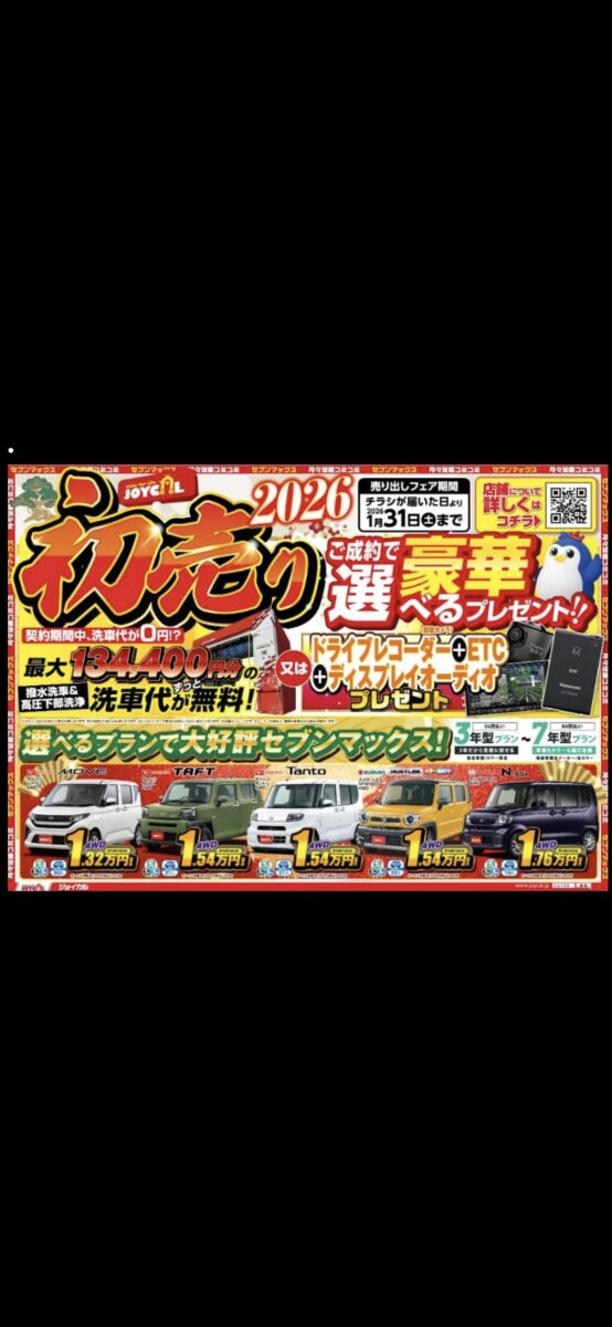 2025.12.28 2026年初売り1月6日~1月31日まで 1月6日~1月31日まで2026年初売りを開催します。 今回は洗車最大134400円分が無料になるorドラレコ、ETC、ディスプレイオーディオのプレゼント企画となっております。 この機会をお見逃しなく!! 一覧へ戻る